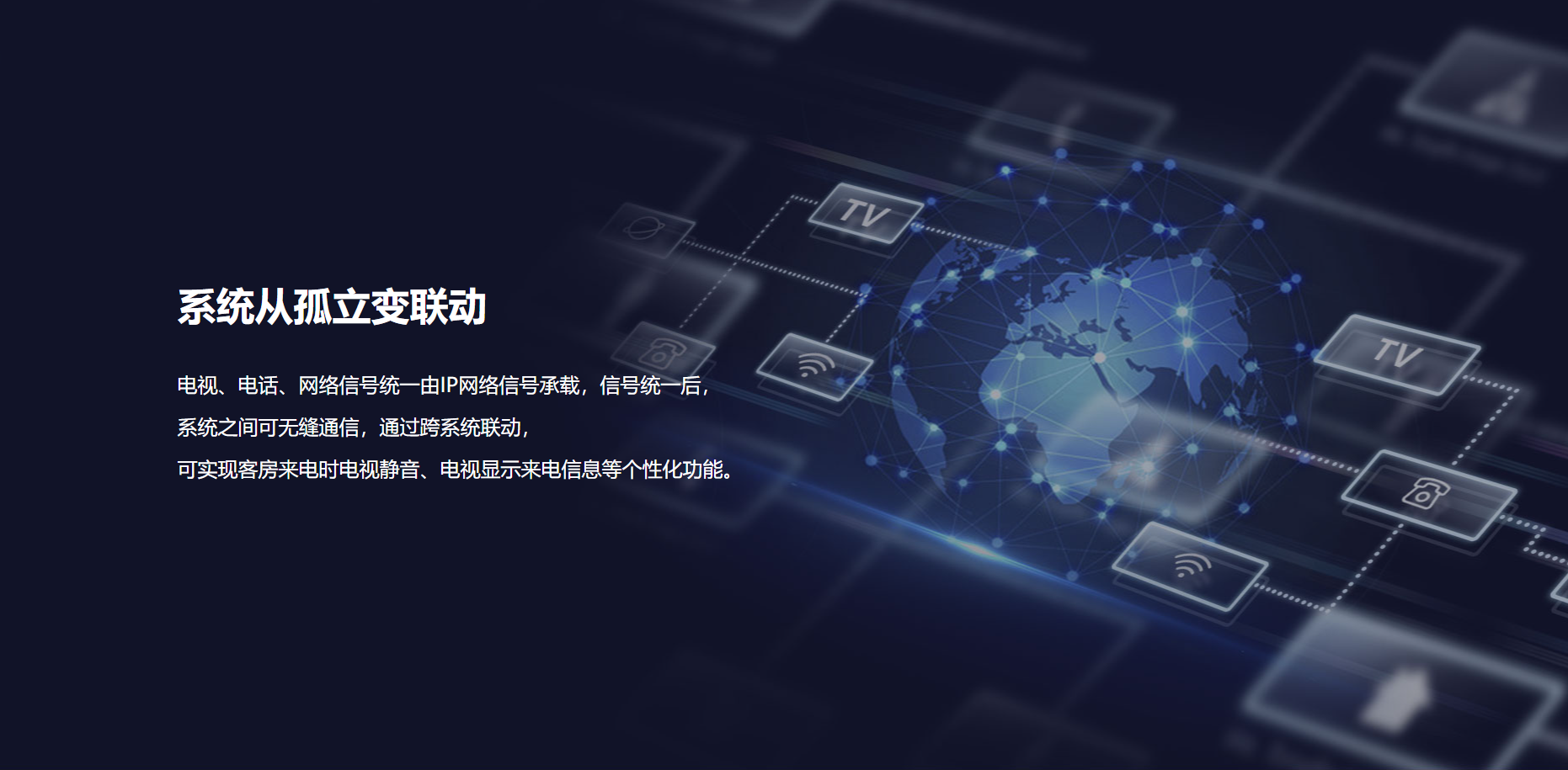 可通过多种控制方式(语言控制、触屏控制、手机控制、面板控制、远程控制),对房内电视、电话、空调、窗帘、灯光等设备进行智能化控制,真正实现全屋联动,升级客房体验。